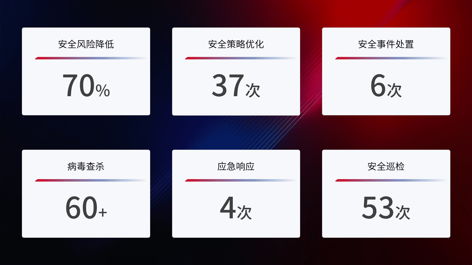 提供全面的安全事件报告体系,,,包括处置报告、、周报、、、、季度和年度总结,,结合持续监控,,帮助客户深入了解网络安全状况。。。。